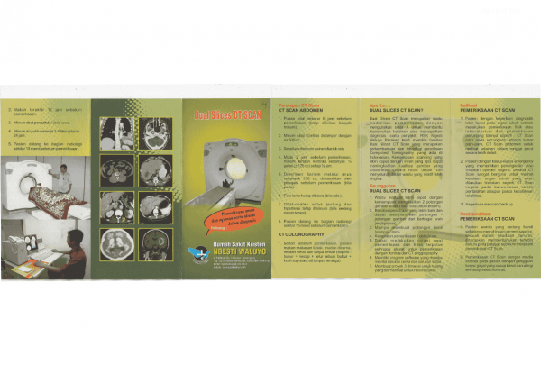 Dual Slices CT Scan merupakan suatu modalitas pemeriksaan dengan mengunakan sinar X untuk membantu menemukan kelainan atau menegakkan diagnosis suatu penyakit. RSK Ngesti Waluyo Parakan telah memiliki fasilitas Dual Slices CT Scan yang merupakan perkembangan dari teknologi pencitraan Computed Tomography yang ada di Indonesian. Kemampuan scanning yang lebih cepat dengan irisan yang tipis dapat meningkatkan kualitas gambar yang dihasilkan secara lebih detail dan menyeluruh dalam waktu yang relatif lebih singkat.