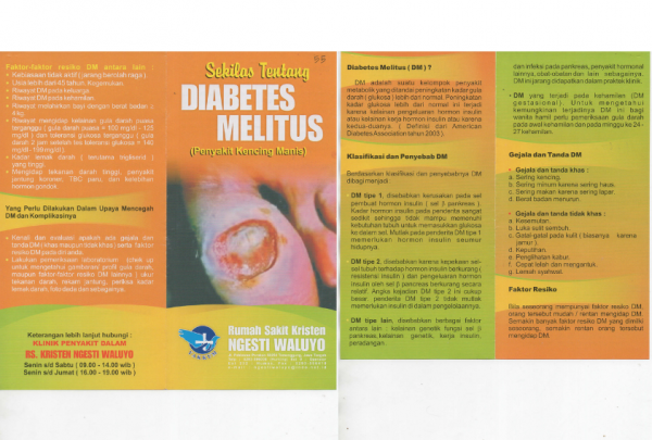 - DM tipe lain, disebabkan berbagai faktor antara lain: kelainan genetik fungsi sel β pankreas, kelainan genetik kerja insulin, peradangan pankreas, penyakit hormonal lainnya, obat-obatan dan lain sebagainya.